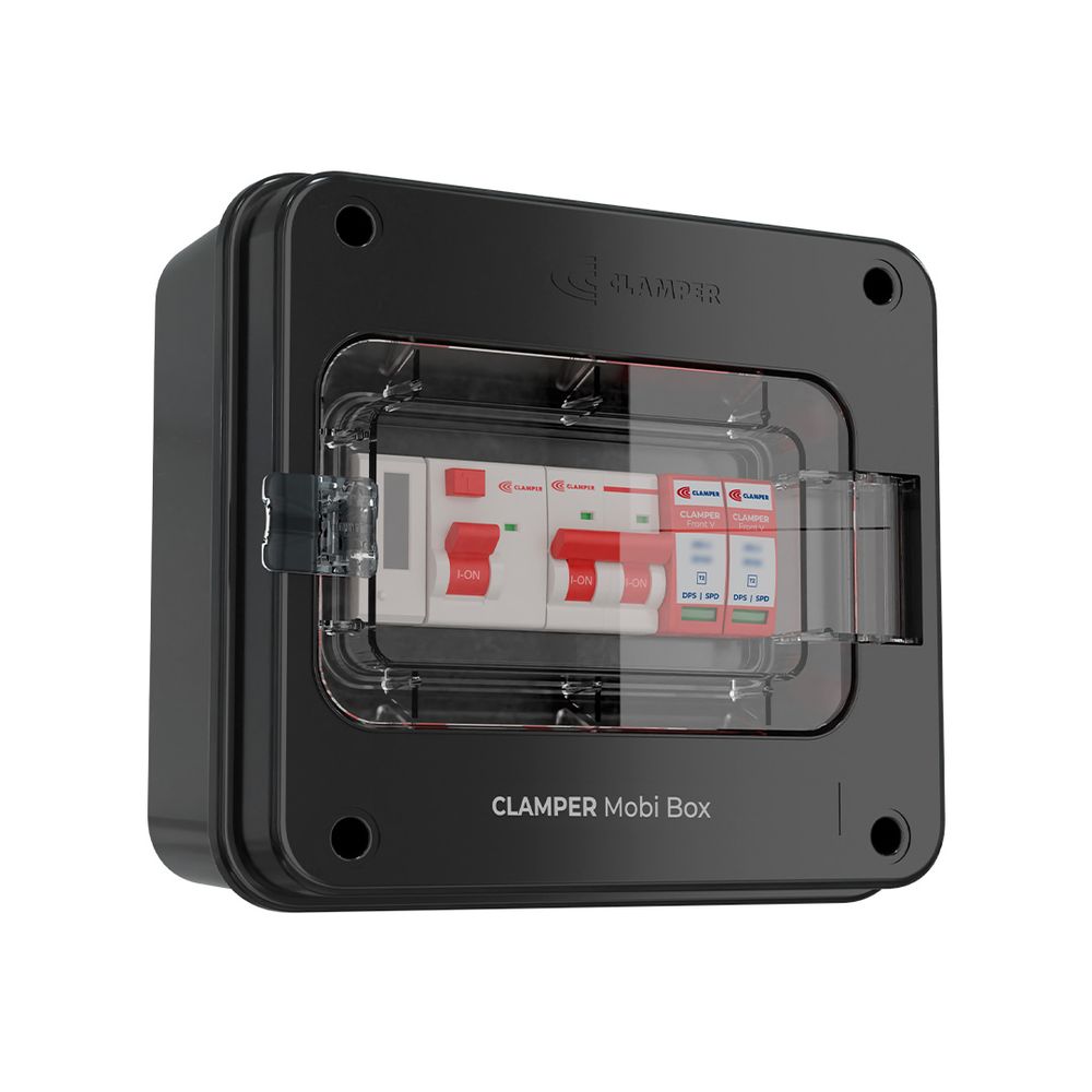 O CLAMPER Mobi Box 220V 8KW P M com Medidor de Consumo é a solução de proteção para carregadores de veículos elétricos com Dispositivo de Proteção contra Surtos (DPS) CLAMPER Front, Interruptor Diferencial Residual (IDR), disjuntor e medidor.