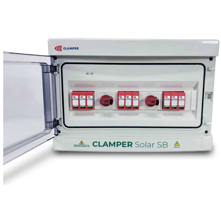 A String Box CLAMPER Solar integra DPS, chave de seccionamento e conectores MC4 para proteção, interrupção e seccionamento entre a série fotovoltaica e o inversor. Pronta para uso externo, suporta até 1040 VDC e 32 A, com invólucro IP65 e kit com conectores solares incluso.